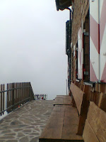 Reitin loppuosa on suorastaan koominen: saavun nimittäin sumusta suoraan vuoristomajan terassille! Kömmin kaiteen yli, ja kahvia sumussa nauttivat ihmiset moikkaavat ihan normaalisti. Hengästyttää, hiki tippuu ja naurattaa. Virnistellen vetäydyn hieman syrjemmälle hengittelemään ja sujautan haisevat kiipeilykengät äkkiä reppuun.
